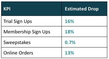 Advertisers can expect conversions to decrease but performance will vary greatly across campaigns. For a higher value (like membership purchases) larger drops are expected, but for a lower value KPI like sweepstakes lesser declines are anticipated. Below are estimated conversion decreases by KPI: