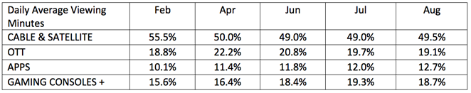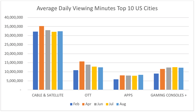 Even with the return of Sports to TV in August, viewing via traditional Cable Box and Satellite has yet to return to pre-COVID-19 levels. Viewers have discovered that quality content is available to them on-demand via ad-supported APPs and are continuing to view them. Additionally, the increased viewing on Amazon Firesticks and Roku devices has fallen back towards pre-COVID-19 share of main screen viewing.