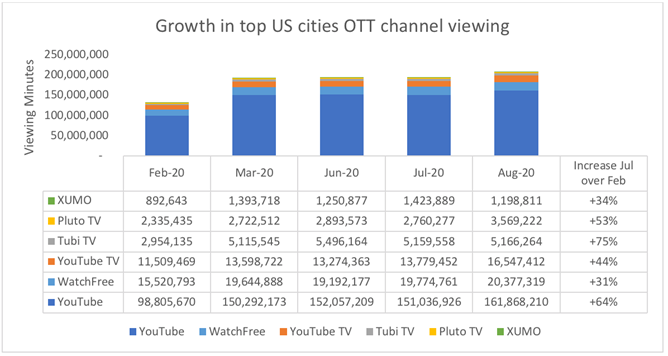 The growth in OTT and APP viewing is not consistent across the top 10 cities in the US and we see some significant differences between cities. What seems to hold true is that APPs viewing is consistently growing at a higher rate than OTT. Digging deeper, we can see that the advertising-supported APPs have quite different viewing levels in different markets, although YouTube is consistently the dominating market leader.