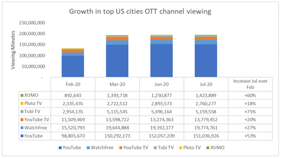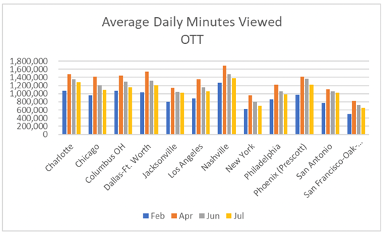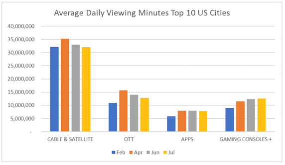 OTT viewing that is measured (Netflix, Amazon Prime & HULU is excluded) gained the greatest total viewing minutes and share during the peak of the COVID-19 crisis in April, but both the total viewing minutes and OTT’s share of viewing minutes have somewhat eroded since that high point. Both numbers are still well above their February pre-COVID-19 point however, we would expect to see the current levels remain consistent for the near future.