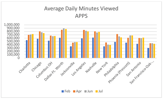 The patterns we have seen in the national summary are generally the same in the top 10 cities we examined, but the total viewing minute levels vary significantly and warrant careful analysis at the hyperlocal level.
