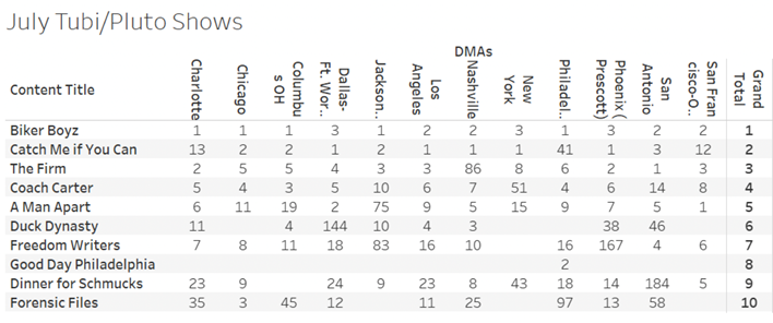 If we look at the content ranked by city for Tubi and Pluto (similar free ad-supported streaming apps), we see that ‘evergreen’ movies are by far the most popular choice.