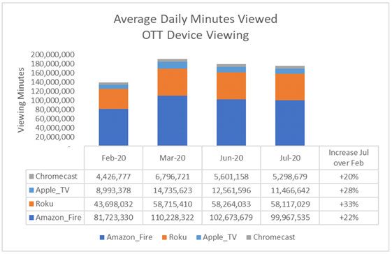 In the peak COVID-19 period, Roku is the only one of the major streaming devices to has held on to their gains in viewing minutes. Amazon Firestick, while far and away the leader in total minutes viewed, has seen approximately 50% of its gains from April erode.