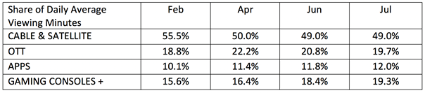 Viewing minutes of broadcast and cable channels via cable and satellite boxes in July have returned to pre-COVID-19 February levels. The dramatic loss of share of total viewing minutes has not returned and has stabilized at the 49% level – a 12% loss of viewing share to streaming that, on current evidence, appears permanent. Based on what we can measure, less than half the viewing usage of the TV main screen is now through a cable or satellite box.
