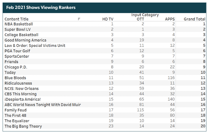 The big increases in ad-supported viewing to traditional cable and satellite distributors we saw during the height of the COVID-19 lockdown have pretty much dissipated, and viewing from Feb. 2020 to Feb. 2021 has remained stable on those platforms. There has been far more growth in device and app viewing in the last 12 months, increasing the ability for advertisers to reach a much greater percentage of the viewing population via addressable and programmatic TV routes. What people are watching hasn’t really changed very much in a year, but how they are watching it continues to evolve as they embrace new ad-supported platforms and devices.
