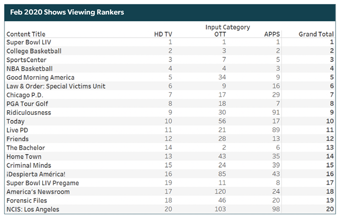 Finally, we looked at the shows people have been watching on ad-supported, main-screen TVs. Things haven’t really changed that much – sports still dominate the viewing rankers – but we can see some shows provided by Smart TV apps inspire repeat viewing (“Friends”, “Big Bang Theory”), which are beginning to rise through the rankings.