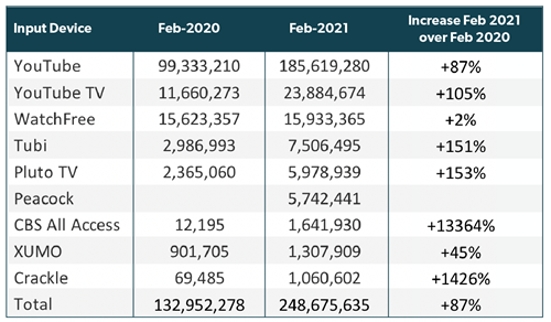 Total ad-supported minutes viewed for Feb. 2021 were 16% up over February 2020, but it wasn’t an even distribution. The biggest gains in ad-supported viewing were via main-screen viewing apps, which increased 54% in the year of COVID-19. Viewing via OTT devices like Amazon Fire TV Sticks and Roku sticks increased 28% in 12 months. Viewing via traditional cable and satellite boxes still make up the majority of ad-supported viewing and did still increase, but only by 5% – significantly less than the overall viewing increase.