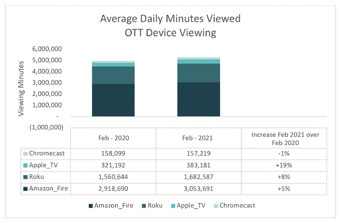 Looking at the OTT devices, we can see that the most growth has come from Apple TV and Roku devices, but the Amazon Fire TV Stick has preserved its dominant lead as the most-viewed OTT device for ad-supported, main-screen TV viewing.
