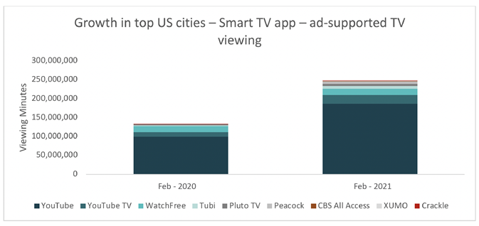 It is viewing of Smart TV apps where we have seen the most explosive growth over the COVID-19 period with an overall 50%-plus increase in ad-supported, main-screen TV viewing. Here we have looked at just the top ad-supported apps (again, Netflix, Amazon Prime Video and Hulu are excluded).