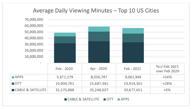 In the last 12 months (Feb. 2020 to Feb. 2021), we have seen ad-supported, main-screen TV viewing (excluding Netflix, etc.) rise steeply during lockdown then fall back somewhat. February 2021 saw daily average ad-supported viewing up 16% in the top 10 US DMAs over last year, but the gain is nearly all accounted for by addressable and connected formats. Plug-in device (such as Amazon Fire TV Sticks and Roku sticks) viewing is up 28% and Smart TV app viewing is up 54%. This has significantly increased the opportunities to effectively reach customized audience segments across the US. Content viewing has not changed significantly as yet with sports still dominant, but we are beginning to see increased viewing of the most popular content (like “Friends”) provided on demand by ad-supported free streaming services.