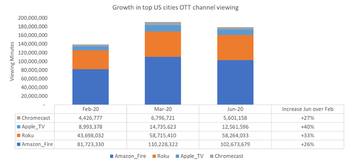 Roku has retained their increased viewing minutes post-peak crisis whereas Amazon, Apple TV, and Chromecast devices have all lost viewing minutes. Total viewing and growth rates to OTT devices vary tremendously by major US city.