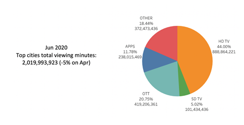 OTT device viewing has gained viewing share and minutes from February and interestingly, its share and total viewing minutes have started to slip back a little post-peak crisis.
