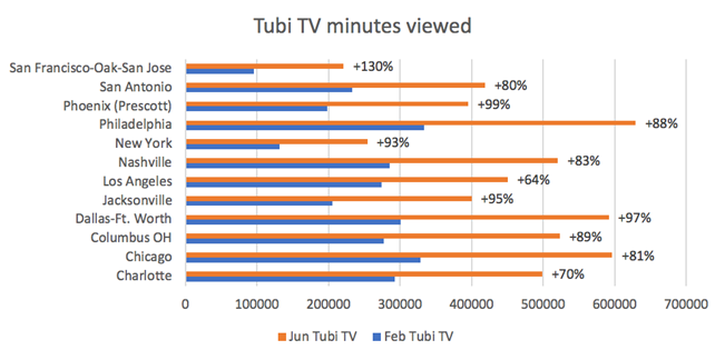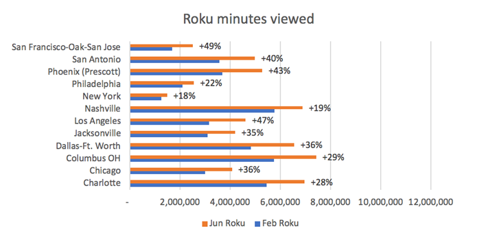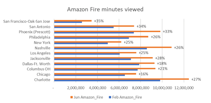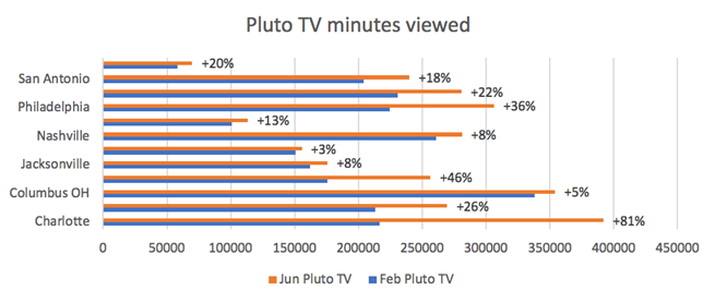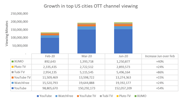 Consumers have discovered the free content available on their Smart TVs and continue to watch those free ad-supported channels post-COVID-19. Again, growth rates and total minutes viewed vary tremendously between major US cities.