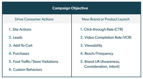 For a campaign seeking to drive consumer actions such as a purchase or lead, we suggest measuring against the KPI Cost Per Action (CPA). For campaigns such as a new brand or product launch seeking to drive awareness. We suggest considering the following KPIs for each: