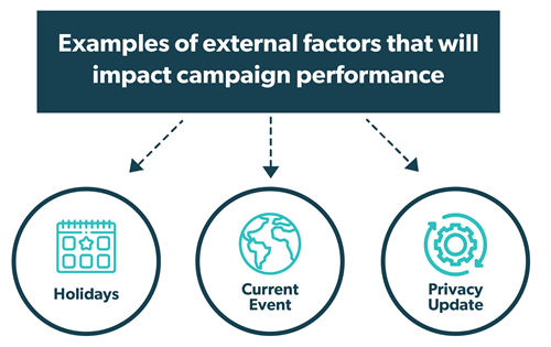 When thinking about optimization options and as you review data after making adjustments, it's important to remember that external factors such as holidays, privacy updates, and current events can and will impact campaign performance. Once a campaign generates enough performance data, external factors tend to not have as much of an impact, but this will naturally vary depending on campaign parameters.