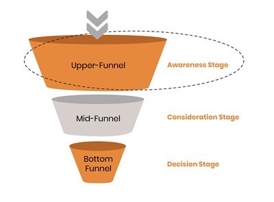 The upper funnel is the beginning of the consumer journey, or where leads first come in. This is the stage where users are just starting their research, trying to find information on products or services needed or desired. There is usually a lot of research at this phase, including investigating different brands and what they have to offer.