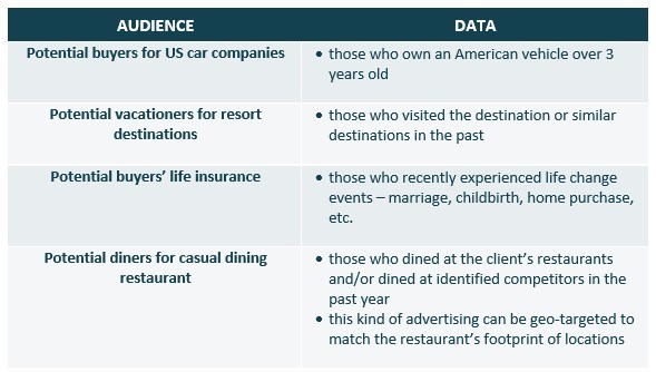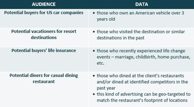 In addition to the data from 3rd party providers, Audience Based Buying can also add all the targeting techniques utilized for Daypart/Program Based Buying (Geographic, Demographic, Behavioral and Contextual).