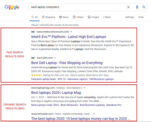 SEO offers the ability to serve up content in Google’s “Organic” results, whereas SEM can only provide impressions within their “Paid” results. For certain users, there can be a significant difference in perception between the two marketing strategies. SEO results are less likely to be perceived as advertising (even though they are driven by marketers), whereas SEM results clearly indicate that they are “Ads” and may generate resistance from potential customers who are hesitant or even outright hostile towards ads.